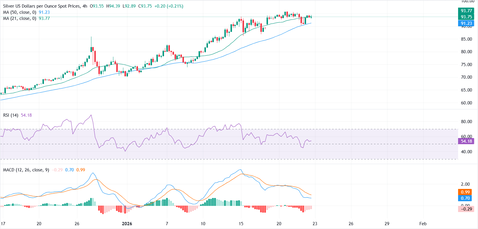4 saatlik grafikte, Gümüş iyi tanımlanmış bir yükselen yapının içinde kalıyor ve şu anda 21 dönemlik Basit Hareketli Ortalama (SMA) ile test ediliyor, bu da anlık yukarı yönlü denemeleri sınırlıyor. 50 dönemlik SMA, 91,20 civarında, daha derin bir destek bölgesini işaret ediyor ve yukarı doğru eğilimini sürdürüyor.