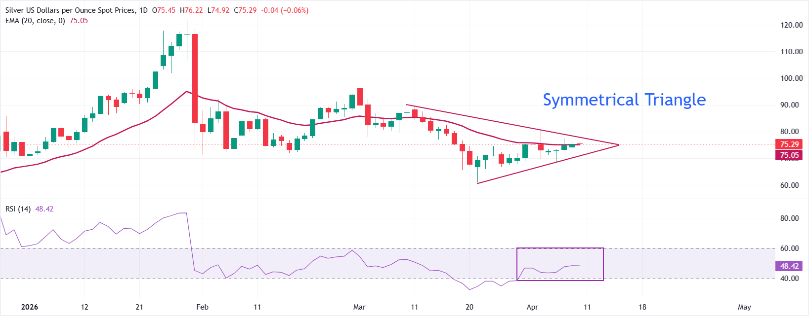 XAG/USD, basın saatinde 75,00$ civarında yatay seyrediyor ve fiyat 20 günlük üssel hareketli ortalama (EMA) olan 75,06$ seviyesine yakın olduğu için kısa vadede genel olarak nötr bir eğilim gösteriyor. Günlük zaman diliminde oluşan Simetrik Üçgen formasyonu, net bir yön hareketinden ziyade konsolidasyonu işaret ederken, 14 günlük Göreceli Güç Endeksi (RSI) 40,00-60,00 bölgesi içinde dengeli bir momentuma işaret ediyor ve önceki düzeltici baskının ardından denge sağlanıyor.