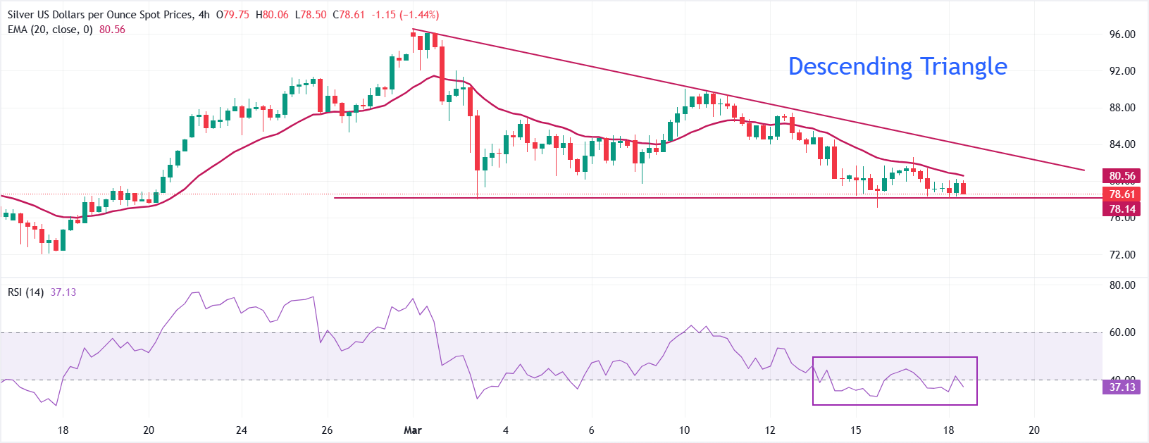 Dört saatlik grafikte, XAG/USD 78,50$ civarında Azalan Üçgen grafik formasyonunda işlem görüyor, bu da keskin bir volatilite daralmasını işaret ediyor. 1 Mart'taki 96,62$'lık zirveden gelen aşağı eğimli sınır, yukarı yönü 84,00$ civarında sınırlıyor. Bu arada, aşağı yön ise 3 Mart'taki 78,00$ civarındaki yatay destekle sınırlı kalmış durumda.