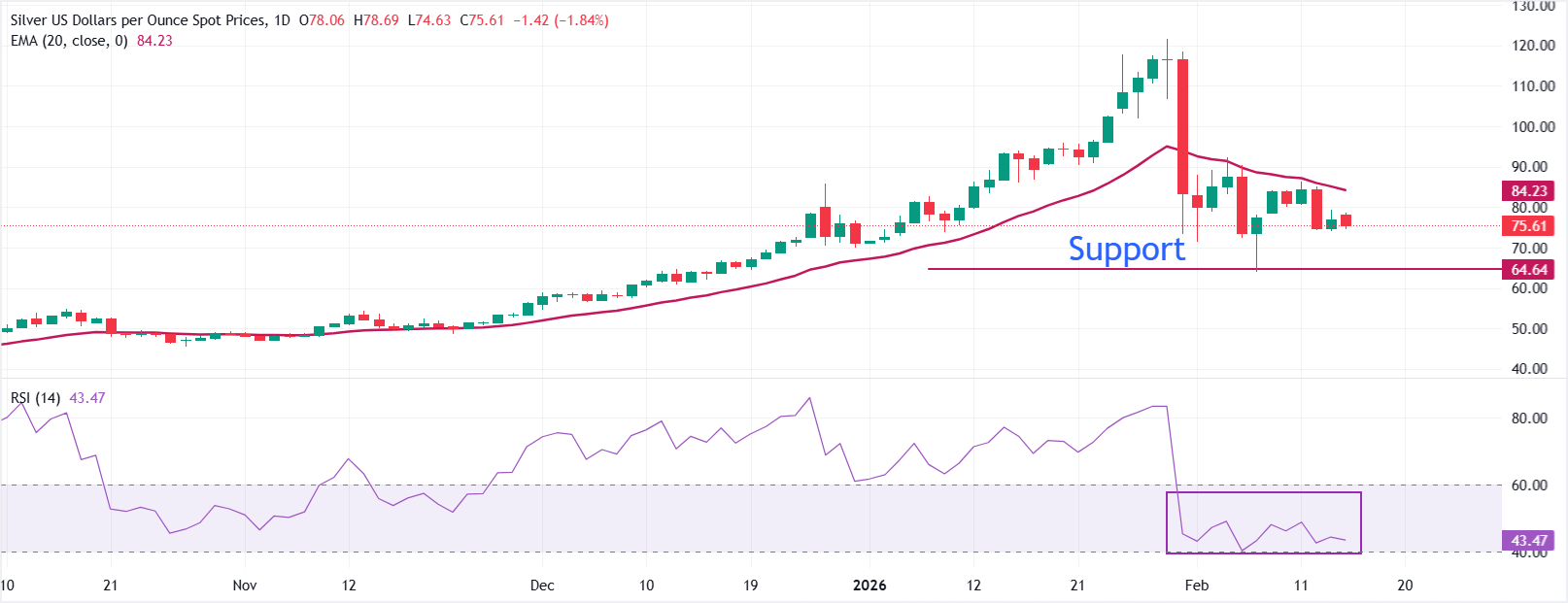 XAG/USD, yazım anında 75,61 $ civarına kadar geriliyor. Fiyat, 84,23 $'daki düşen 20-EMA'nın altında kalıyor ve kısa vadeli eğilimi aşağı yönlü tutarak baskıyı sürdürüyor. Ortalama, sürekli bir arzı vurgulayarak düşmeye devam ediyor. RSI 43,47 ile 50 orta çizgisinin altında yer alıyor ve zayıf momentumun onayını veriyor, teslimiyet değil.