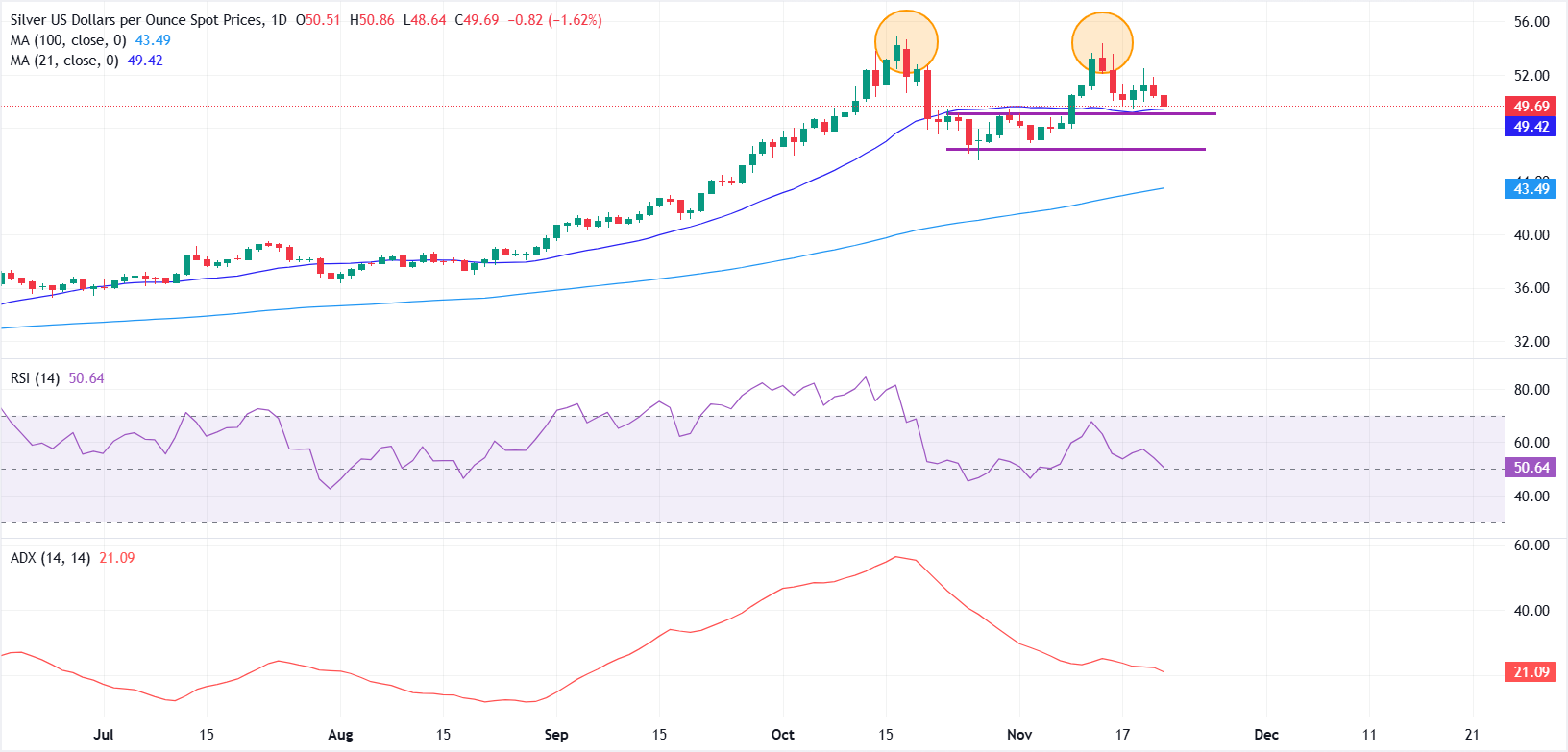 Gümüş fiyatı (XAG/USD), cuma günü 48,64$'te yeni bir haftalık dip seviyesine işaret ettikten sonra önceki kayıplarının bir kısmını azaltıyor. Bu satırların yazıldığı sırada, metal 49,69$ civarında işlem görüyor, mütevazı bir şekilde toparlanıyor ancak gün içinde neredeyse %1,50 değer kaybetmiş durumda ve haftalık bir düşüş yolunda ilerliyor.