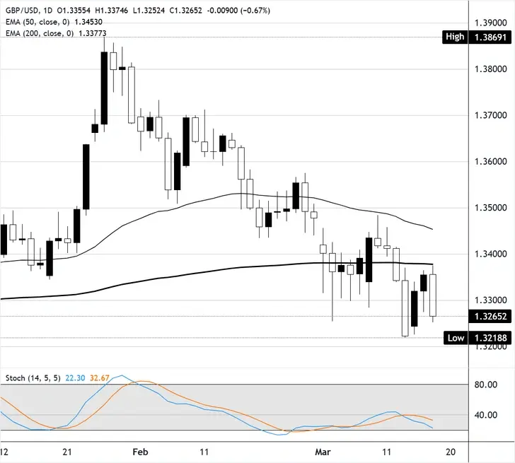 GBP/USD, çarşamba günü yaklaşık %0,7 düşerek 1,3300 seviyesinin altına kaydı ve parite teknik seviyelerle mücadele etmeye devam ediyor. Satış baskısı, ocak ayı sonundaki 1,3870 civarındaki zirveden geri çekilmeyi uzatıyor ve parite şu anda her iki ana günlük hareketli ortalamanın altında işlem görüyor. Çarşamba günkü belirleyici düşüş mumu, son iki haftadaki kararsız fiyat hareketinin aşağı yönde çözüldüğünü gösteriyor.