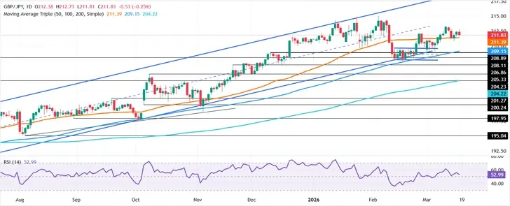 GBP/JPY, çarşamba günü %0,20'lik kayıplar kaydederken, yatırımcılar perşembe günü Japonya Merkez Bankası'nın para politikası kararını bekliyor. Orta Doğu çatışmasının tırmanması nedeniyle riskten kaçınma, Japon Yeni'nin güvenli liman cazibesini artırarak, pariteyi günlük 212,73 zirvesine taşıyan önceki kayıpları azalttı. Yazının yazıldığı sırada, çapraz parite 211,82 seviyesinden işlem görüyor.