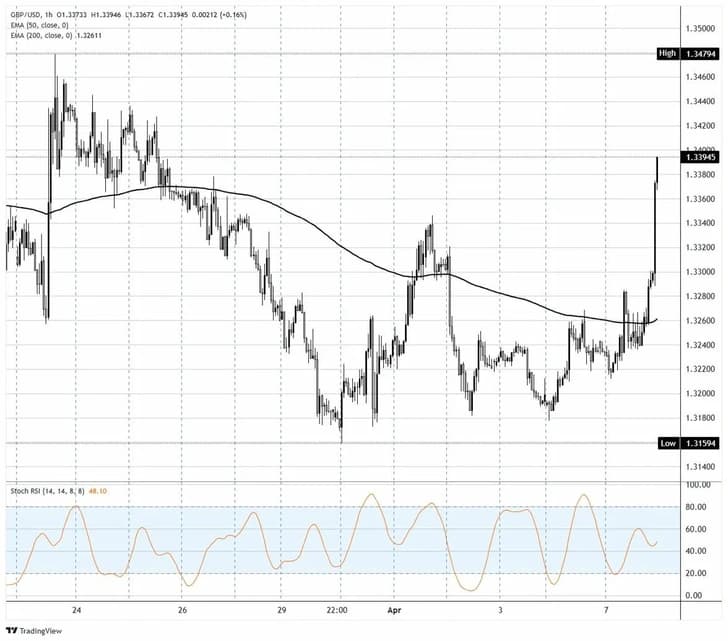 GBP/USD, salı günü ABD Başkanı Trump'ın İran ile iki haftalık ateşkes açıklamasıyla tetiklenen risk iştahı dalgası altında ABD Doları'nın zayıflamasıyla sert yükseldi. Parite, düşük 1,3200'lerden üst 1,3300'lere tırmanarak 50 ve 200 dönemlik saatlik hareketli ortalamaların üzerine çıktı.
