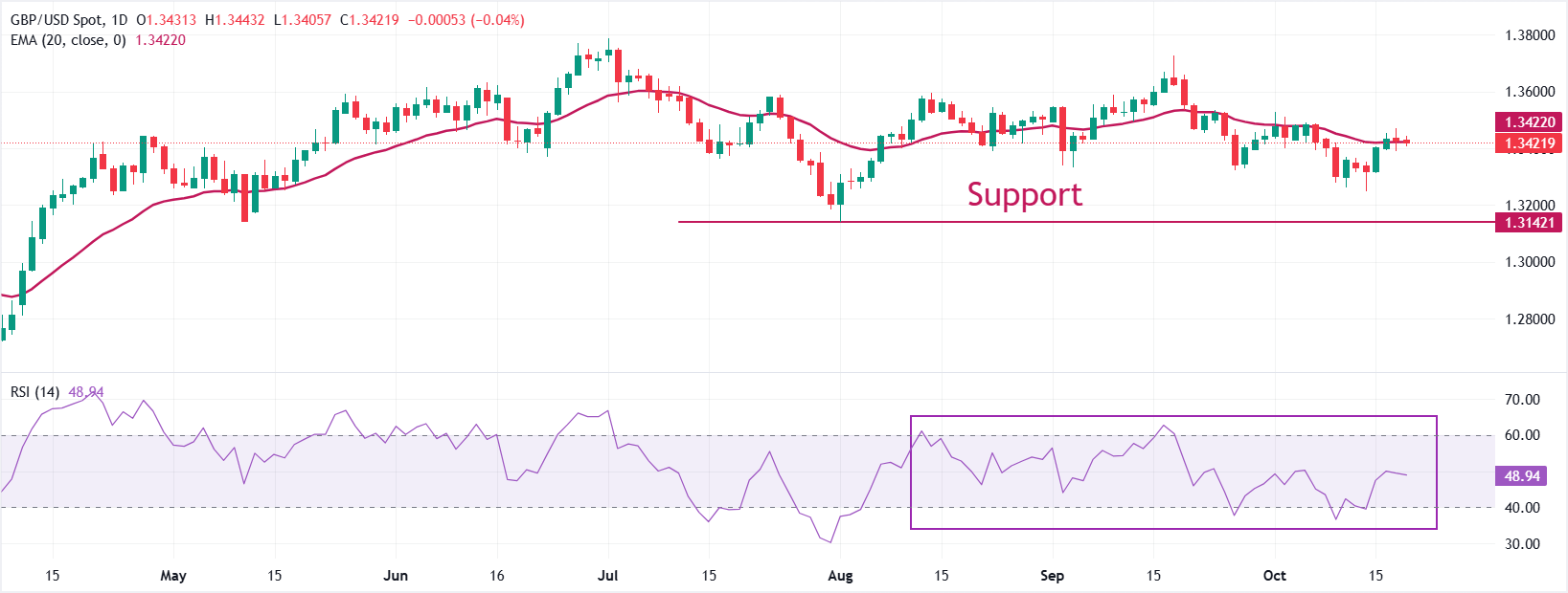 İngiliz Sterlini, pazartesi günü ABD Doları karşısında 1,3425 civarında dar bir aralıkta işlem görüyor. GBP/USD paritesi, 1,3423 civarında işlem gören 20 günlük Üstel Hareketli Ortalama'nın (EMA) üzerine çıkmak için çaba sarf ediyor.