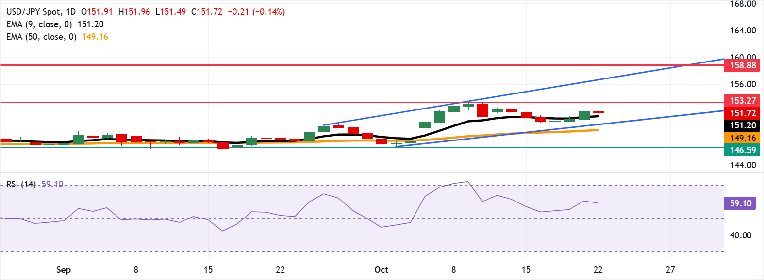 Hızlı destek, 151,20'deki dokuz günlük Üstel Hareketli Ortalama (EMA) seviyesinde görünüyor. Bu seviyenin altında bir kırılma, kısa vadeli fiyat momentumunu zayıflatacak ve USD/JPY paritesinin 150,00 civarında yükselen kanalın alt sınırını test etmesine neden olacaktır; ardından 149,16'daki 50 günlük EMA gelecektir. Daha fazla düşüş, düşüş eğiliminin ortaya çıkmasına ve paritenin 146,59'daki aylık en düşük seviyenin etrafında gezinmesi için aşağı yönlü baskı oluşturmasına neden olacaktır.