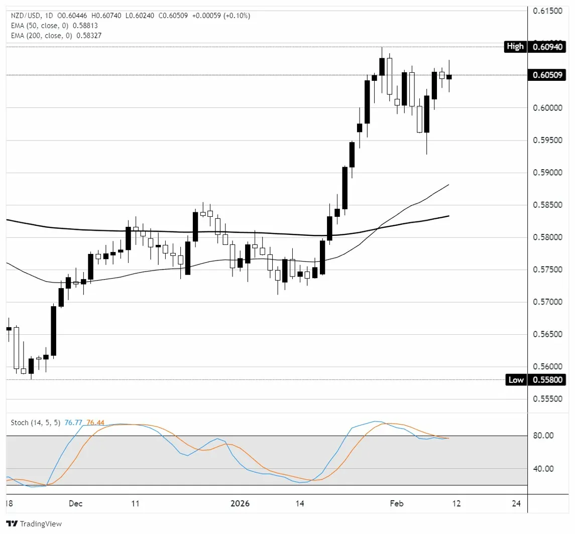 Yeni Zelanda Doları, Ocak ayında 130 bin iş eklenmesini gösteren Çarşamba günkü ABD Tarım Dışı İstihdam (NFP) raporunun ardından ABD Doları karşısında birkaç aylık zirvelerine yakın seyrediyor. Bu rakam, 70 binlik tahminin üzerinde, ancak 2025 yılına ait istihdam verilerinde 898 binlik aşağı yönlü bir revizyonla gölgelenmiş durumda; bu durum, ABD işgücü piyasasının kötüleştiği görüşünü pekiştiriyor. Federal Rezerv (Fed), Ocak toplantısında faiz oranlarını %3,50 ile %3,75 arasında sabit tuttu ve piyasalar, yumuşak işgücü trendinin daha fazla gevşemeye işaret etmesi nedeniyle bu yıl iki ek faiz indirimi fiyatlıyor.