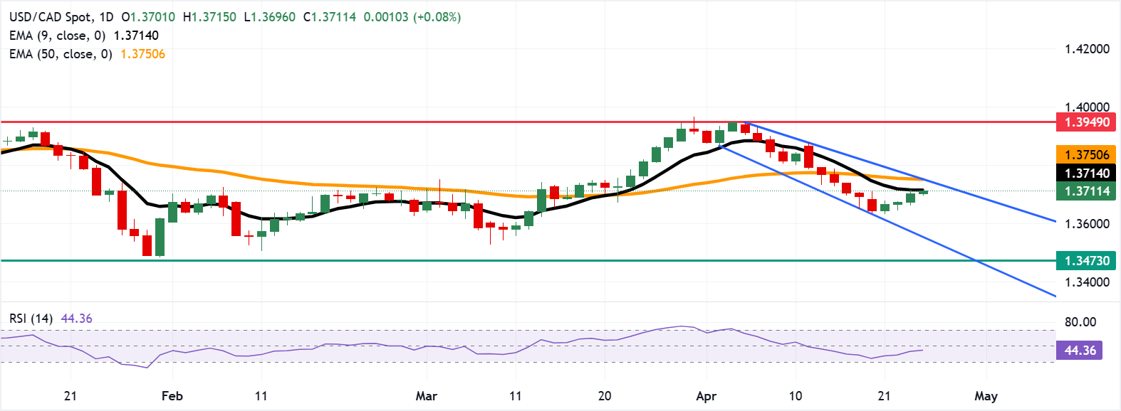 USD/CAD, üst üste dördüncü gün kazanç serisini sürdürerek cuma günü erken Avrupa saatlerinde 1,3710 civarında işlem gördü. Ancak, günlük grafiğin teknik analizi, paritenin azalan kanal formasyonu içinde kalmaya devam ettiğini ve kalıcı bir düşüş eğilimi sinyali verdiğini gösteriyor.