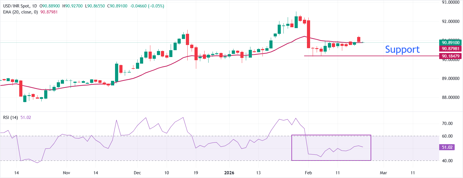 USD/INR son olarak, 90,85 civarında işlem görüyor. Fiyat, 90,888 seviyesindeki 20 günlük Üstel Hareketli Ortalama'nın (EMA) hemen üzerinde kalırken, ortalama son zamanlardaki bir düşüşün ardından düzleşiyor ve konsolidasyonu işaret ediyor. EMA'daki hafif artış, spotun altında ilk destek geliştiğini gösteriyor.