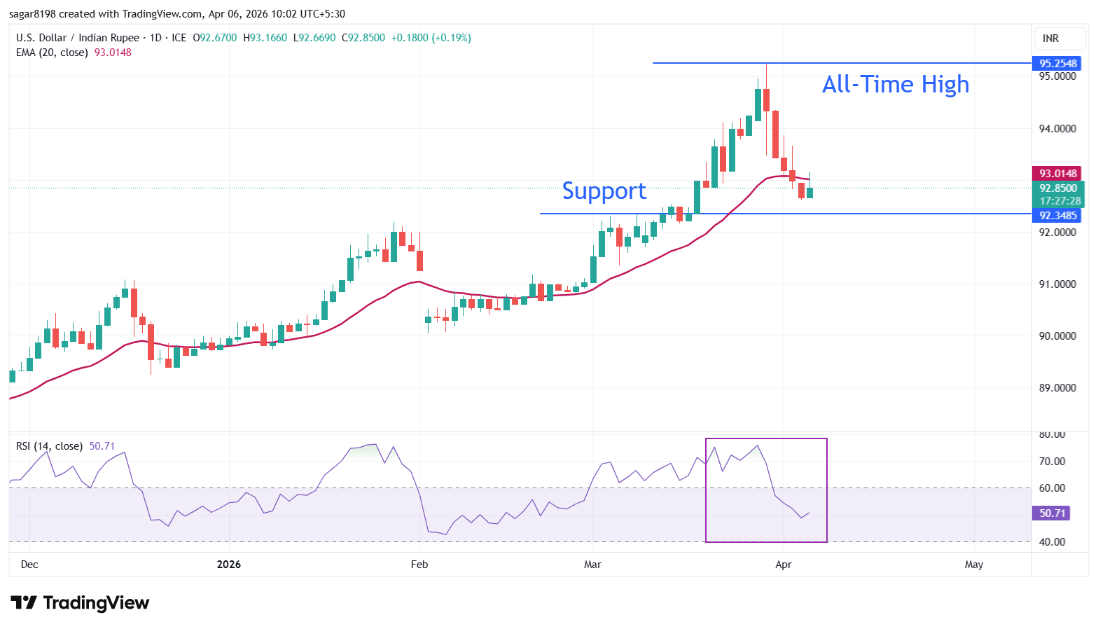 USD/INR, pazartesi günü açılış işlemlerinde 92,85 civarına yükseldi. Kısa vadeli eğilim düşüş yönlüdür çünkü 20 günlük Üstel Hareketli Ortalama (EMA), spot fiyatın toparlanmasını sınırlıyor. Ancak, daha geniş yapı yükseliş eğilimini koruyor; daha yüksek tepeler ve daha yüksek dipler formasyonu bozulmamış durumda.