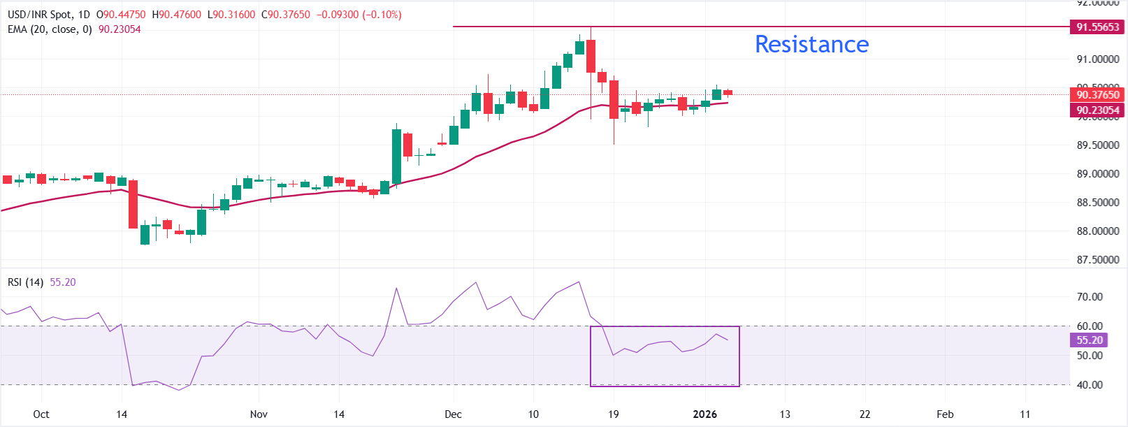 Günlük grafikte, USD/INR 90,3765 seviyesinden işlem görüyor. Parite, 90,2305 seviyesindeki yükselen 20 günlük Üstel Hareketli Ortalama'nın (EMA) üzerinde kalıyor ve bu, son geri çekilmenin ardından daha geniş bir yükseliş trendini destekliyor. Ortalama eğimi düzleşmiş durumda, ancak fiyat hareketi dinamik destek olarak onu dikkate almaya devam ediyor.