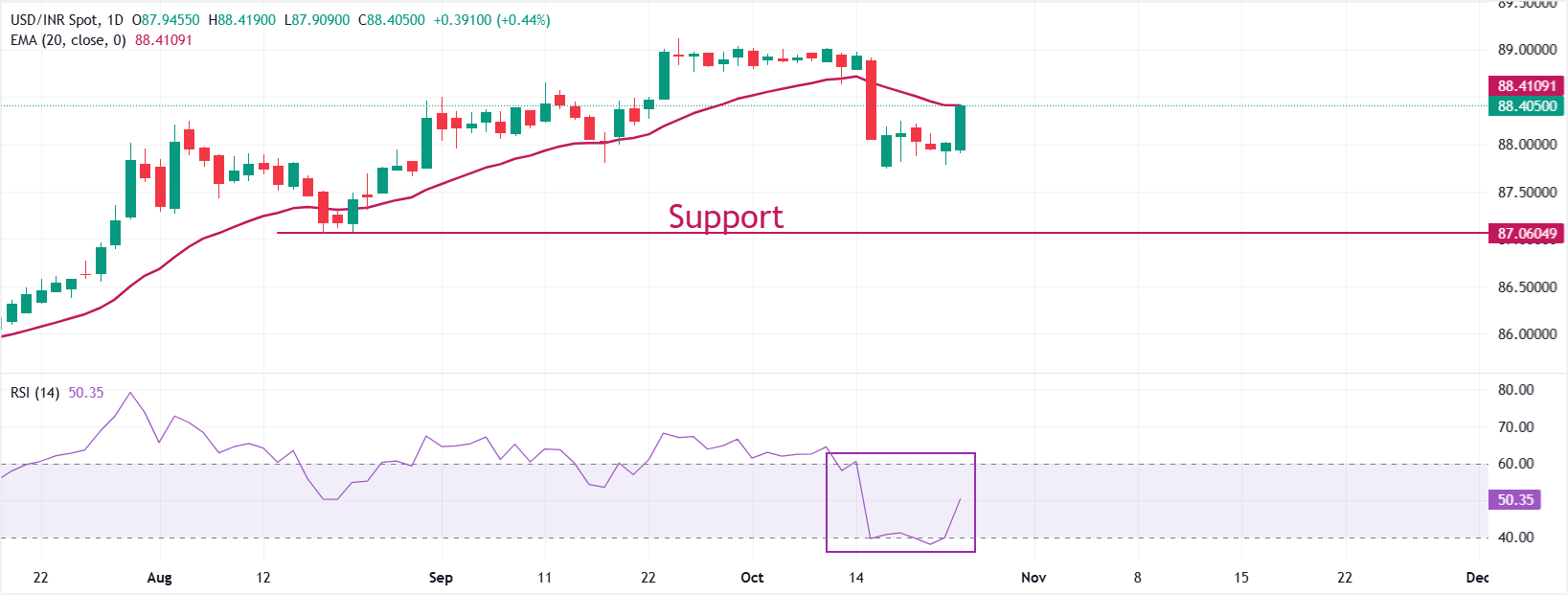 USD/INR paritesi, haftanın başında 88,40 civarına yükseliyor. Parite, 88,40 civarında işlem gören 20 günlük Üstel Hareketli Ortalama'nın (EMA) civarına geri dönüyor.