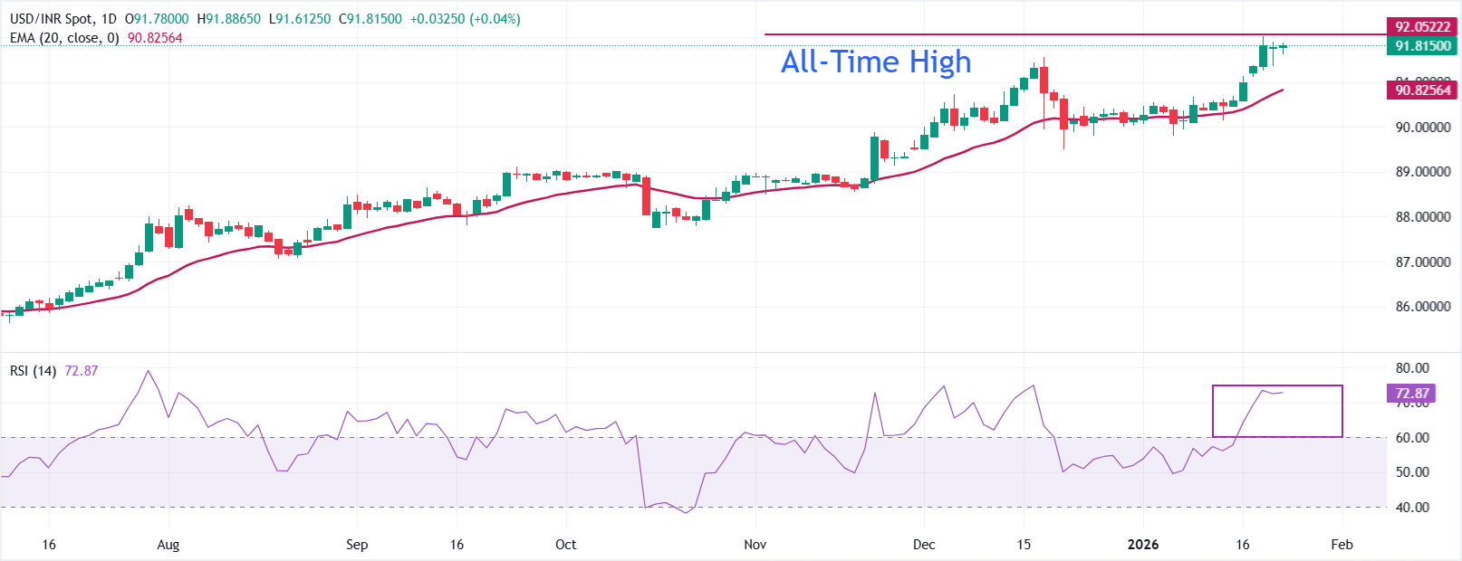 USD/INR, bu satırların yazıldığı sırada 91,8115 seviyesinde sağlam bir şekilde işlem görüyor. 20 günlük Üstel Hareketli Ortalama (EMA) 90,8253 seviyesinde yukarı yönlü bir trend izliyor ve bu yükselişi destekliyor. Fiyat, bu yükselen 20 günlük EMA'nın üzerinde kalıyor ve kısa vadeli eğilimi yukarıda tutuyor.