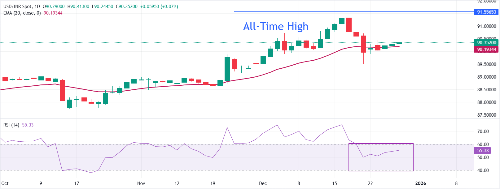 Hint Rupisi (INR), 2025'in son haftasının başlangıcında ABD Doları (USD) karşısında hafif bir düşüşle açılıyor. USD/INR paritesi, Hindistan Merkez Bankası'nın (RBI) aralık ayı ortasındaki müdahalesi nedeniyle yaşanan satışların ardından, Hindistan ithalatçılarının hem yerel hem de offshore piyasalarda ABD Doları (USD) talebinin güçlü olması nedeniyle 90,35 civarına yükseliyor.