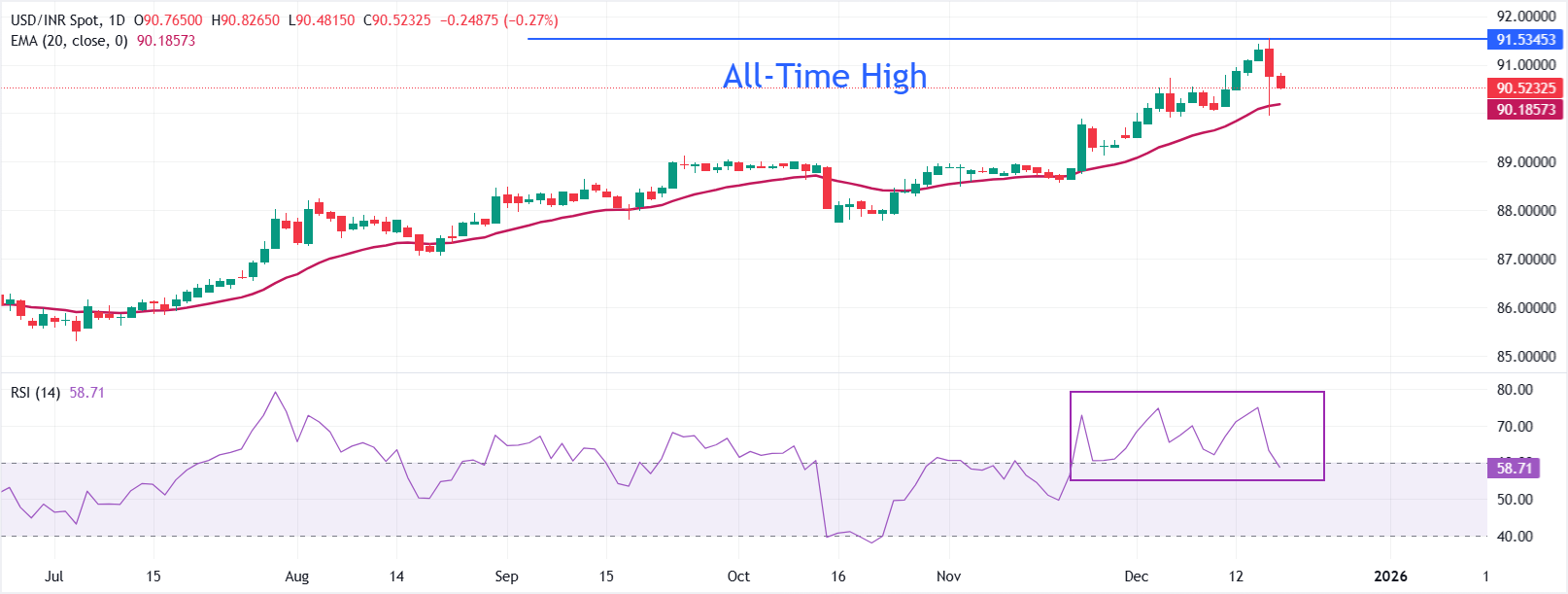 Teknik Analiz: USD/INR, 91,55 ile tüm zamanların en yüksek seviyesinden düzeltme yapıyor