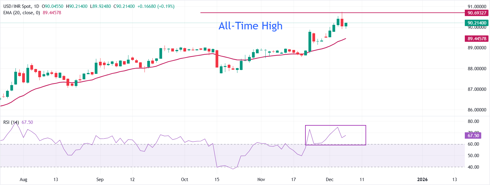 USD/INR, cuma günü açılış seansında 90,20 civarına yükseliyor. Parite, 90,70 civarında yeni bir tüm zamanların en yüksek seviyesine ulaştıktan sonra perşembe günü düzeltme yaptı.