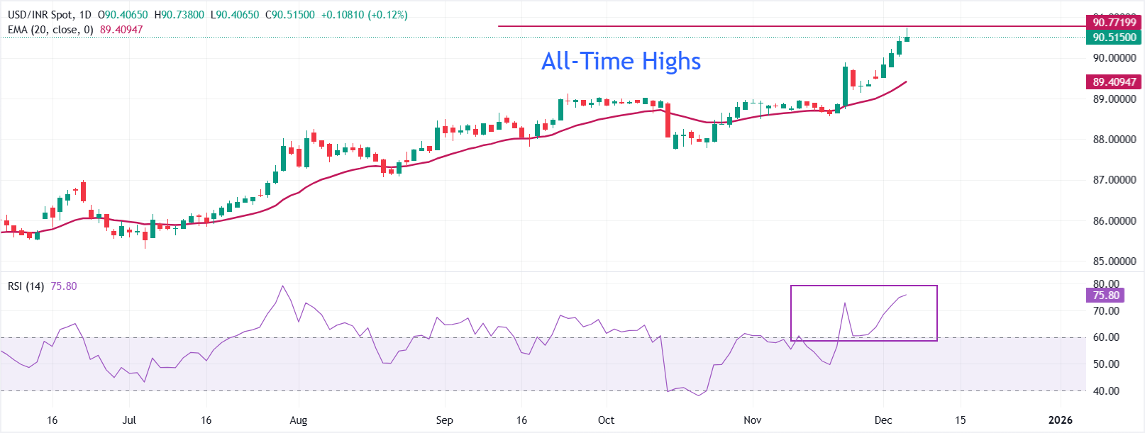 USD/INR, perşembe günü açılışta 90,70 civarında işlem görüyor. 20 günlük Üstel Hareketli Ortalama (EMA) 89,40 civarında yükselmeye devam ediyor ve fiyat bunun üzerinde kalıyor, bu da kısa vadeli yükseliş tonunu pekiştiriyor.