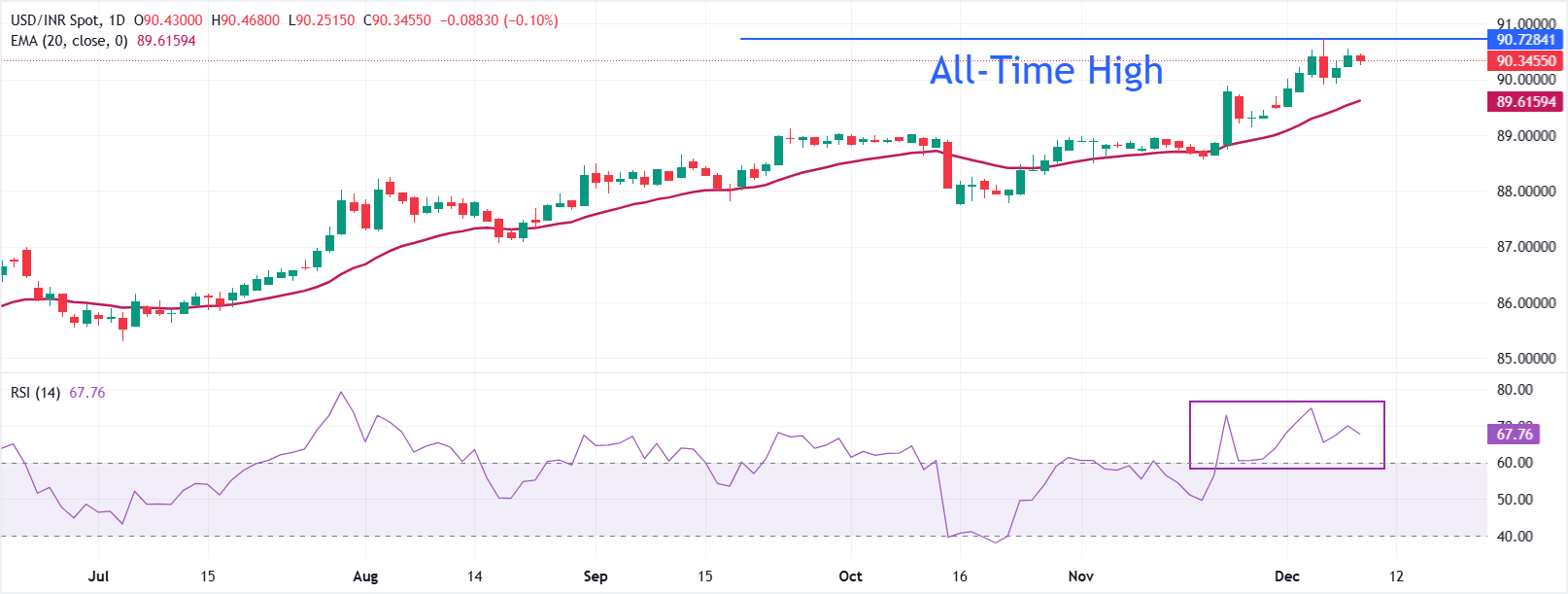 USD/INR, bu satırların yazıldığı sırada 90,3455 seviyesinde işlem görüyor. 20 günlük Üstel Hareketli Ortalama (EMA) 89,6159'da yükseliyor ve parite bunun üzerinde kalarak yükseliş eğilimini koruyor.