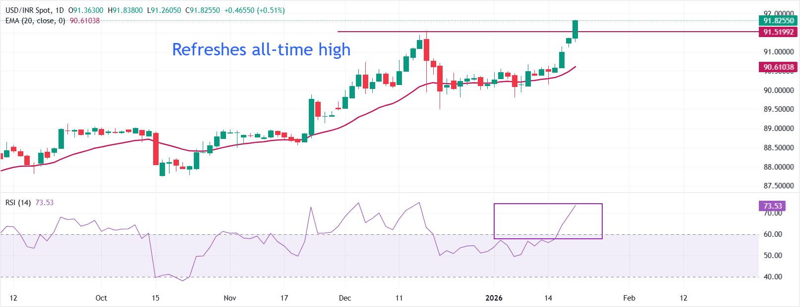 USD/INR, 91,85 civarına yükseliyor. 90,60'taki 20 günlük Üssel Hareketli Ortalama (EMA) yükseliyor ve bu ilerlemeyi destekliyor, fiyat bu dinamik tabanın üzerinde kalıyor.