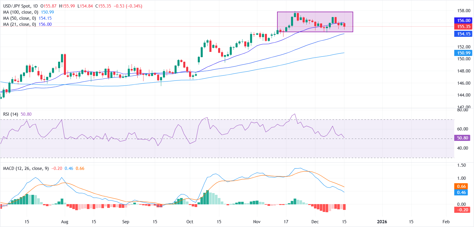 Teknik açıdan bakıldığında, USD/JPY, 20 Kasım'da 158,00 seviyesinin yakınında reddedilmesinin ardından konsolidasyon aşamasında kalıyor. Parite şu anda 156,00 civarında 21 günlük Basit Hareketli Ortalama'nın (SMA) hemen altında dalgalanıyor ve bu seviye acil direnç olarak işlev görüyor ve yukarı yönlü denemeleri sınırlıyor. Bu seviyenin üzerinde sürdürülebilir bir hareket, yükseliş momentumunu canlandırmak ve 157,00-158,00 bölgesini açmak için gereklidir.