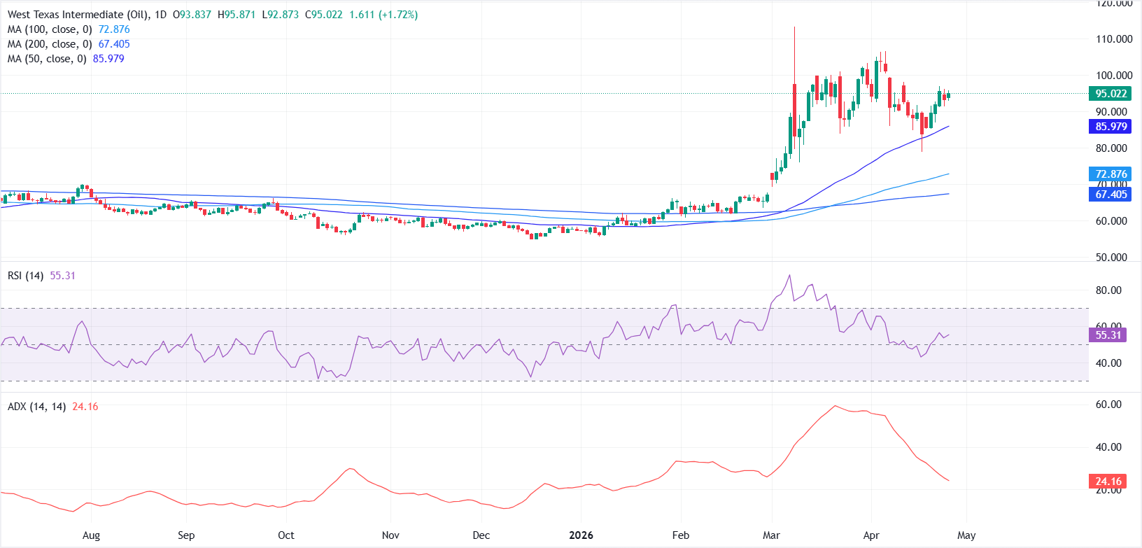 Amerikan Batı Teksas ham petrolü (WTI) pazartesi günü sabit kalıyor, çünkü tıkanan ABD-İran barış görüşmeleri Hürmüz Boğazı'nın yakın zamanda yeniden açılacağına dair umutları azaltıyor. Yazının yazıldığı sırada, WTI varil başına yaklaşık 95,00$ civarında işlem görüyor ve değişen jeopolitik haberler volatilitenin yüksek kalmasına neden oluyor.