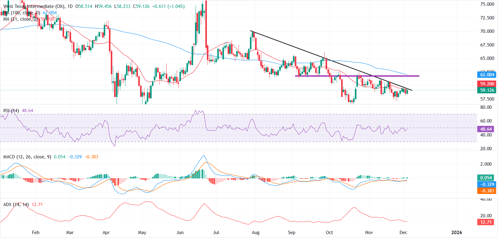 Aşağıda, ilk destek 58,00$ civarında yer alıyor ve ardından 57,00$ civarındaki Kasım dipleri geliyor; bu seviyenin altına inmek, daha derin kayıpların kapısını açabilir.