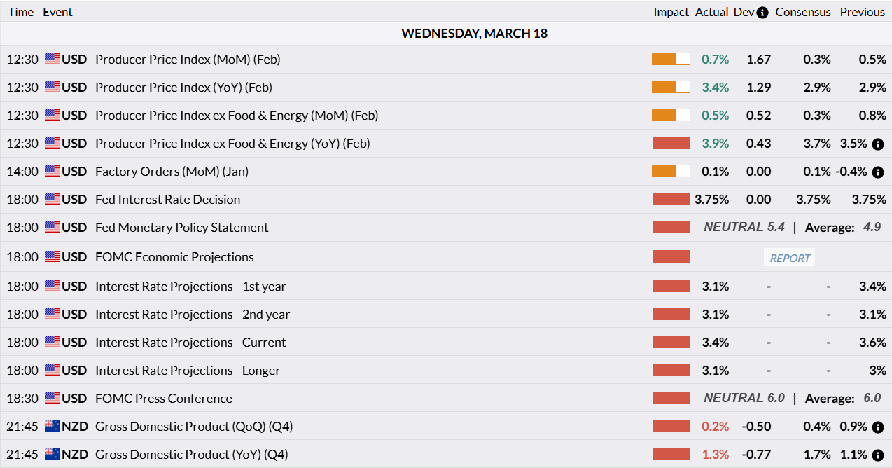 ABD Doları tarafında, Federal Rezerv (Fed) faiz oranlarını sabit tuttu ve 2026 için bir indirim öngörüsünü sürdürdü. Fed Başkanı Jerome Powell, enflasyon ilerlemesinin umulduğundan daha yavaş olduğunu belirtti ve güncellenmiş projeksiyonlar 2026 çekirdek enflasyon tahminini %2,5'ten %2,7'ye yükseltti. Çarşamba günü Üretici Fiyat Endeksi (PPI), manşet PPI'nin %0,3 konsensüse karşılık %0,7 olarak gelmesiyle sıkılaşmacı bir arka plan ekledi. Perşembe günü ABD ilk işsizlik başvuruları ve Philadelphia Fed İmalat Anketi açıklanacakken, Yeni Zelanda'nın Şubat ayı ticaret dengesi verileri Kiwi için haftanın takvimini tamamlayacak.